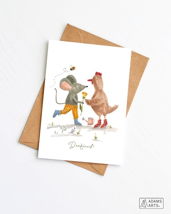 Handgeschilderd ontworpen kaart van een kip met een muis en de tekst 'Dankjewel'. A6 formaat met bruine gerecyclede envelop. Lees meer
