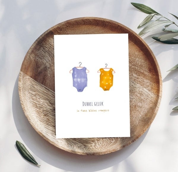 Handgeschilderd ontworpen geboortekaart van twee rompers. A6 formaat met bruine gerecyclede envelop. Lees meer