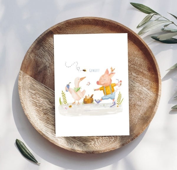 Handgeschilderd ontworpen kaart van een picknickende varken en eend. A6 formaat met bruine gerecyclede envelop. Lees meer