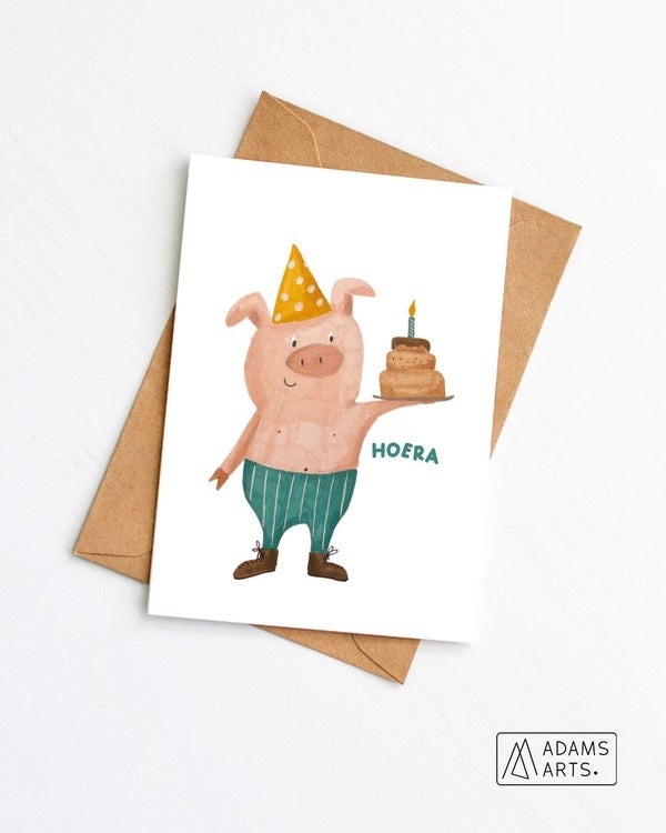 Handgeschilderd ontworpen kaart van een varken met taart. A6 formaat met bruine gerecyclede envelop. Lees meer