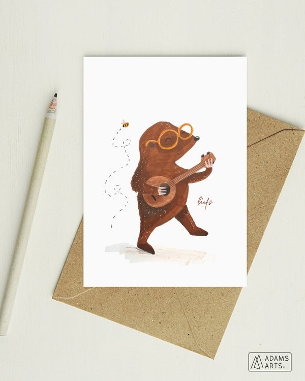 Handgeschilderd ontworpen kaart van een mol met een banjo en de tekst 'liefs'. A6 formaat met bruine gerecyclede envelop. Lees meer