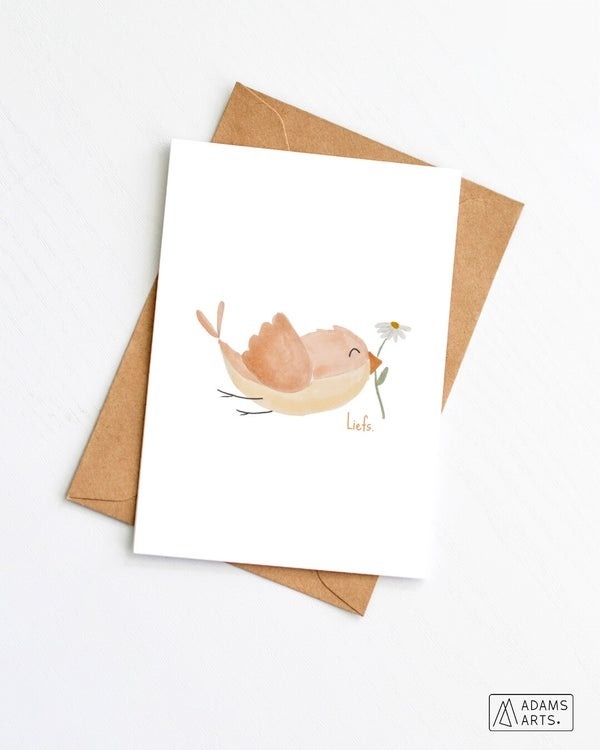 Handgeschilderd ontworpen kaart van een vogeltje met bloem in z'n snavel. A6 formaat met bruine gerecyclede envelop. Lees meer