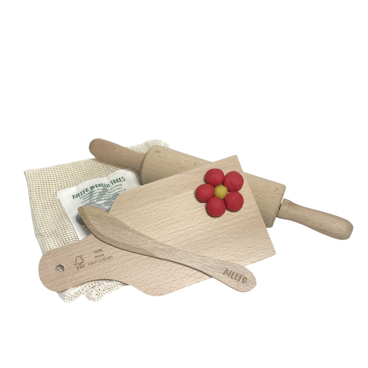 Set van houten snijplank, houten mesje en houten roller. Perfect om te spelen met klei of kinetisch zand. Geleverd in een handig netje.