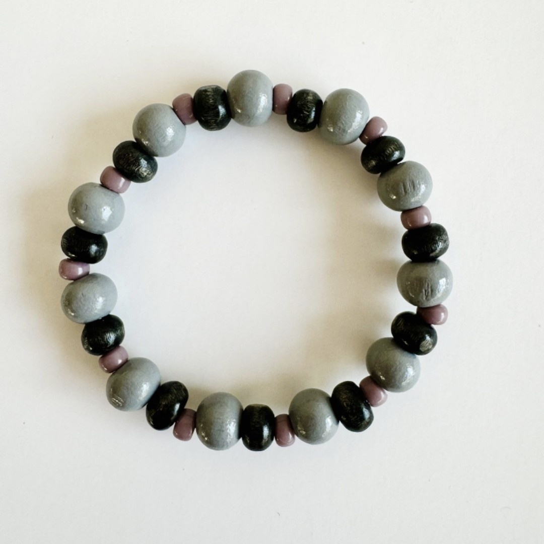 Stoere kralenarmband in paars, zwart en grijs tinten Lees meer