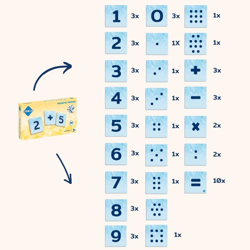 Met Coblo kun je nu ook leren tellen en sommen maken! Maak van je magnetische tegels een leuk spel met deze magnetische cijfers die je aan je magnetische tegeltjes kunt laten kleven. Er zijn eindeloze mogelijkheden om sommen te maken en te leren tellen.