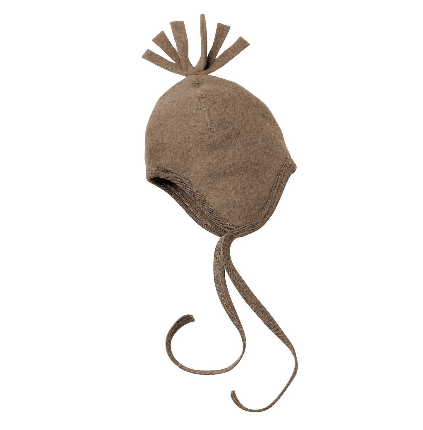Wol fleece is een super zachte, dikke en toch luchtige stof. Het beschermt je baby buiten goed tegen de kou. Door de lange koorden die je kunt strikken blijft de muts altijd perfect zitten. Op de 'kruin' van de muts zitten leuke franjes