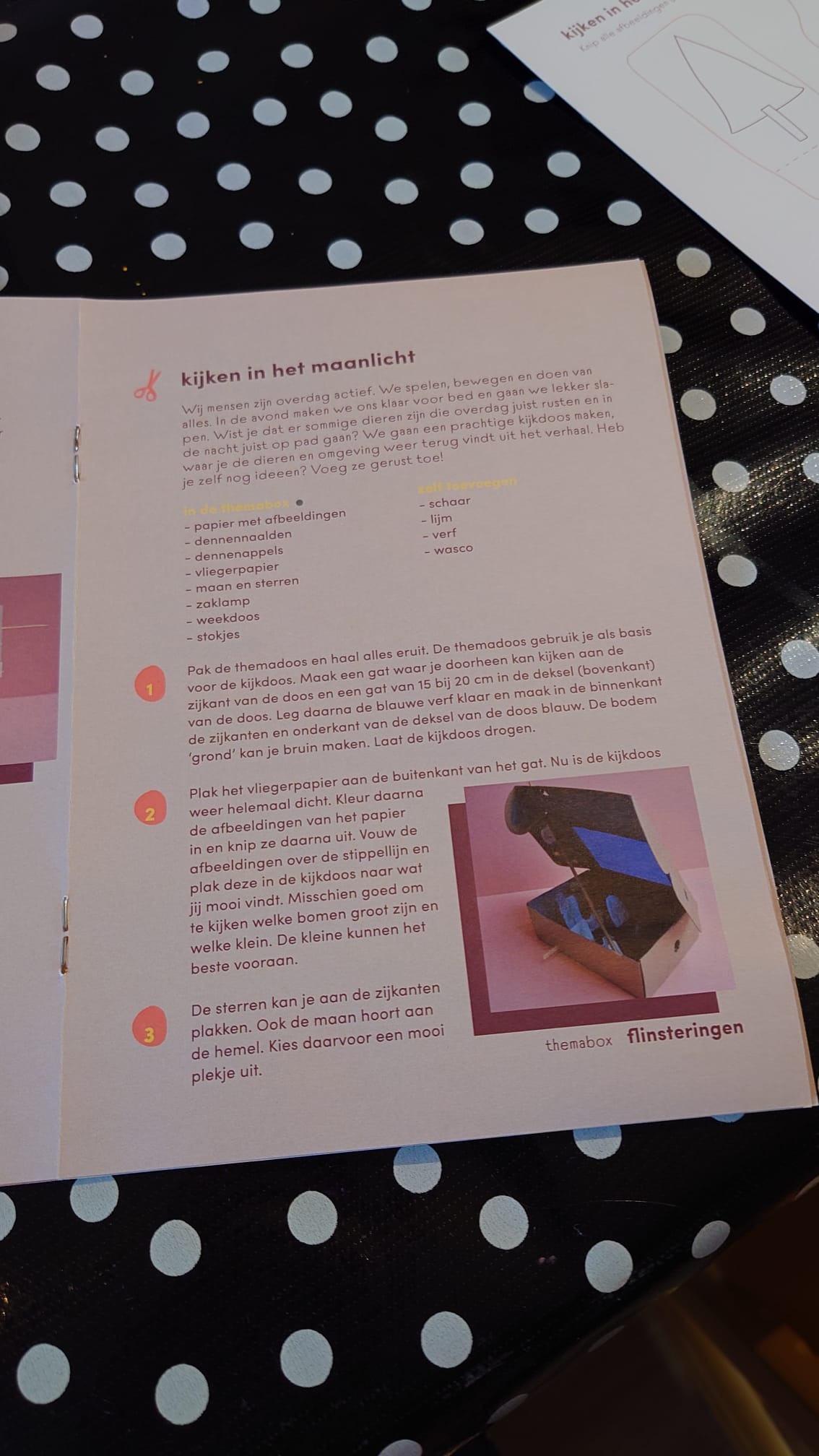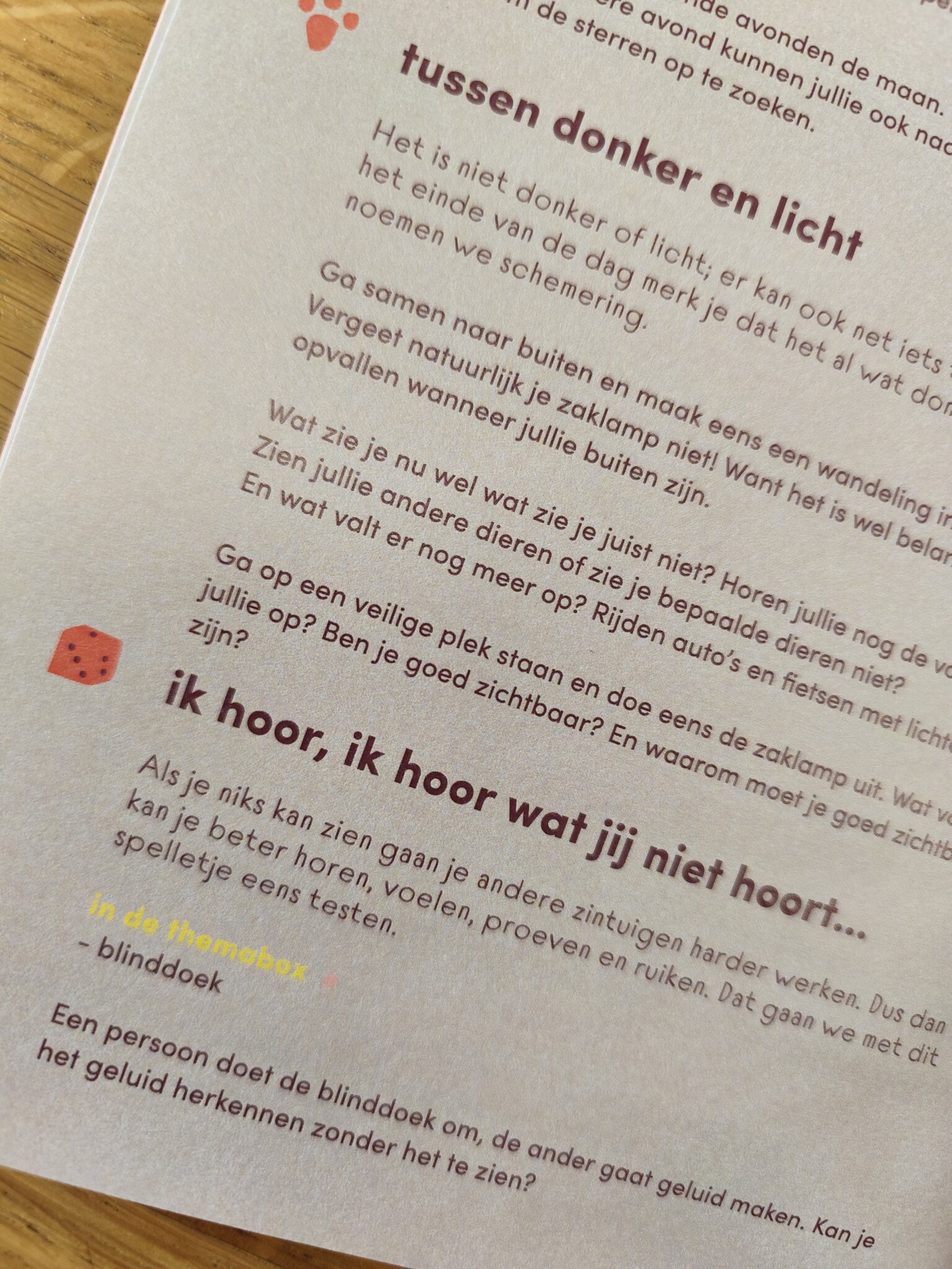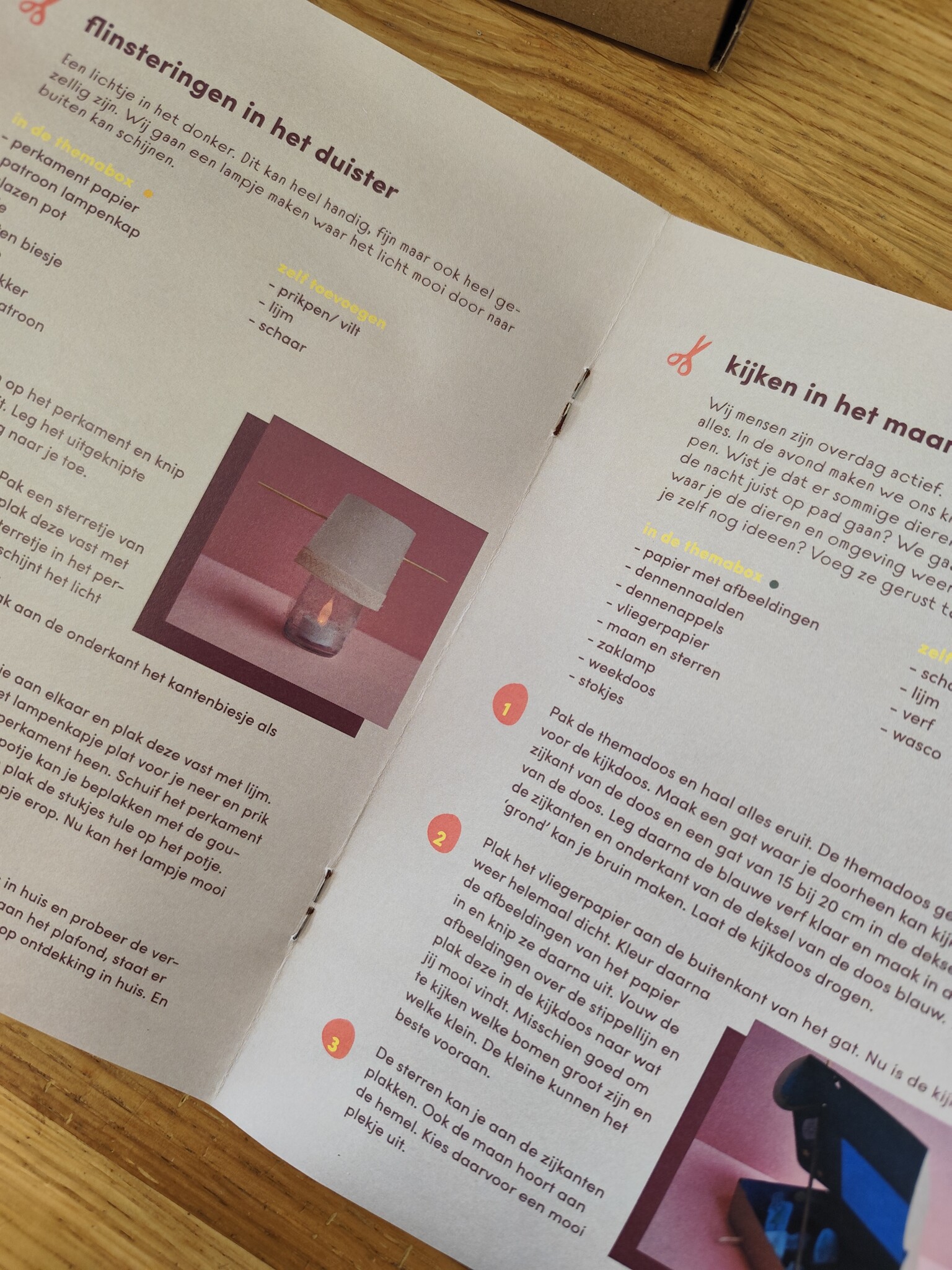 Aan de hand van een fantasierijk verhaal, wordt je meegenomen in het thema flinsteringen. De activiteiten uit deze box sluiten hier allemaal op aan. Denk aan bijvoorbeeld een lampje knutselen en ontdekken wie er 's nacht actief is.