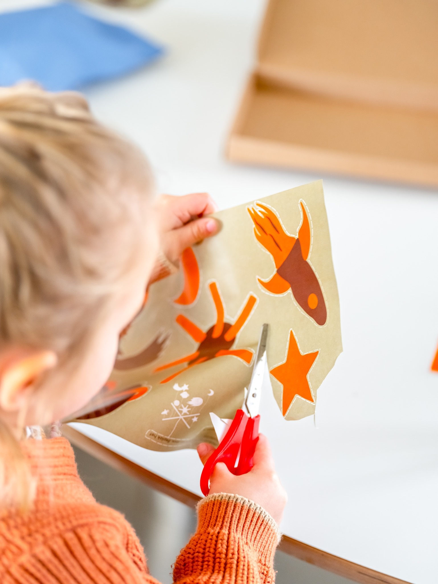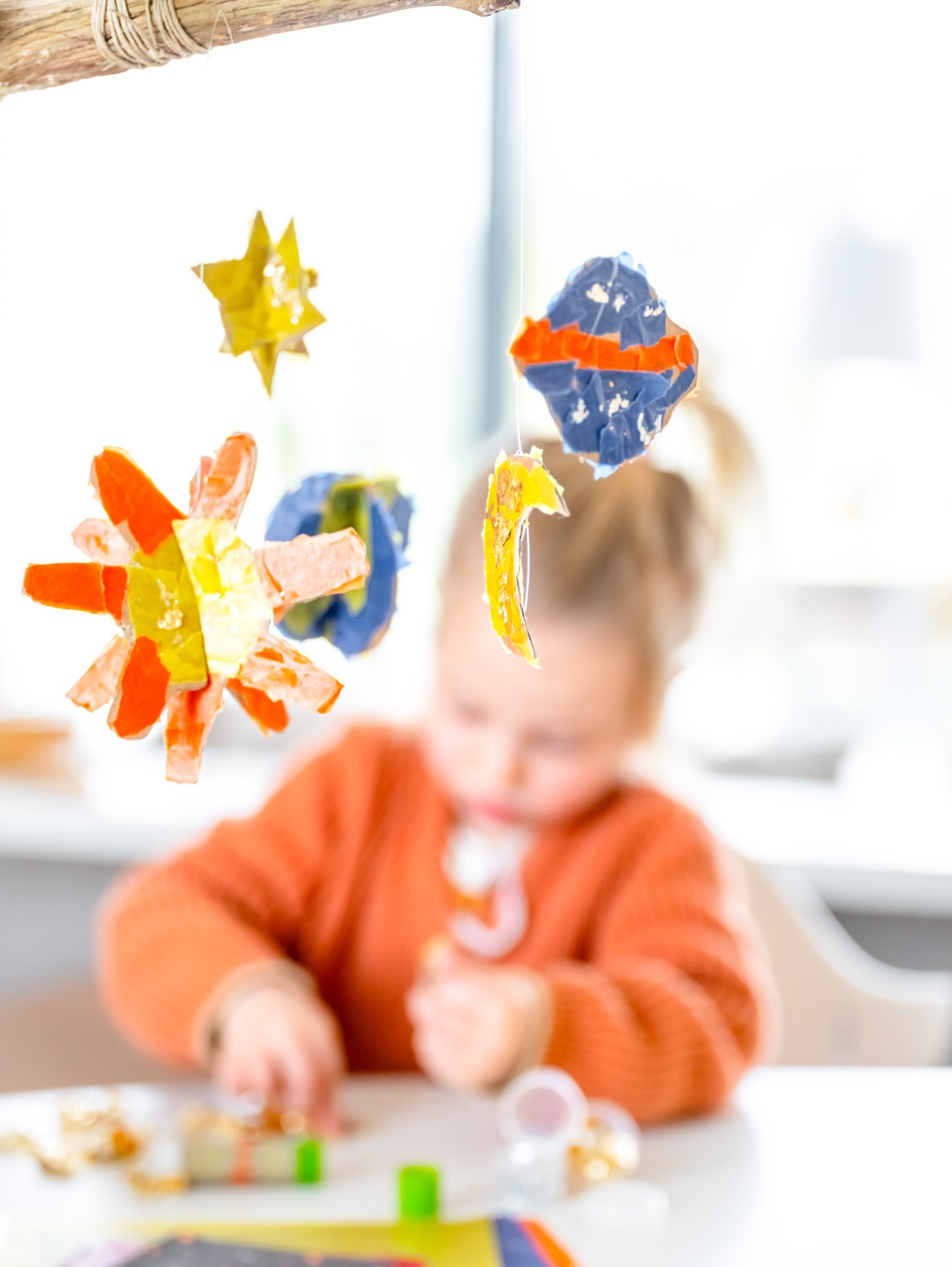 Na het verhaal kan je zelf een mooie ruimte mobiel knutselen. De verschillende materialen; goud en zilver folie, decopatch papier, vliegerpapier, visdraad en touw stimuleren de zintuigen én motoriek.