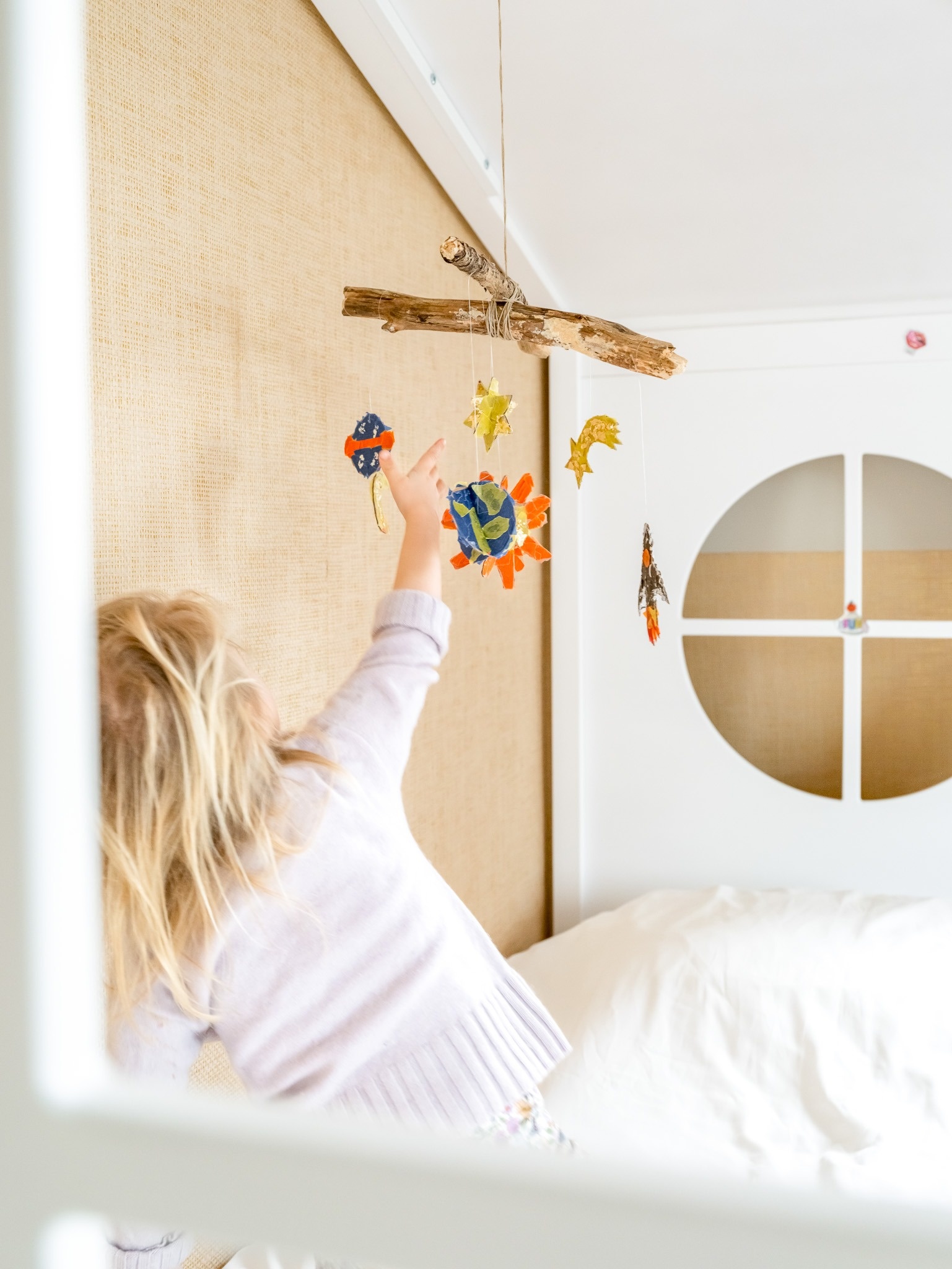 De ruimte mobiel maak je vast aan de zelf gezochte takken uit de natuur. Zo maak je je prachtige mobiel helemaal af en kan je hem een mooi plekje geven in je slaapkamer, woonkamer of ander speciaal plekje! Je kan er naar kijken, mee spelen, maar nét wat jij wilt!