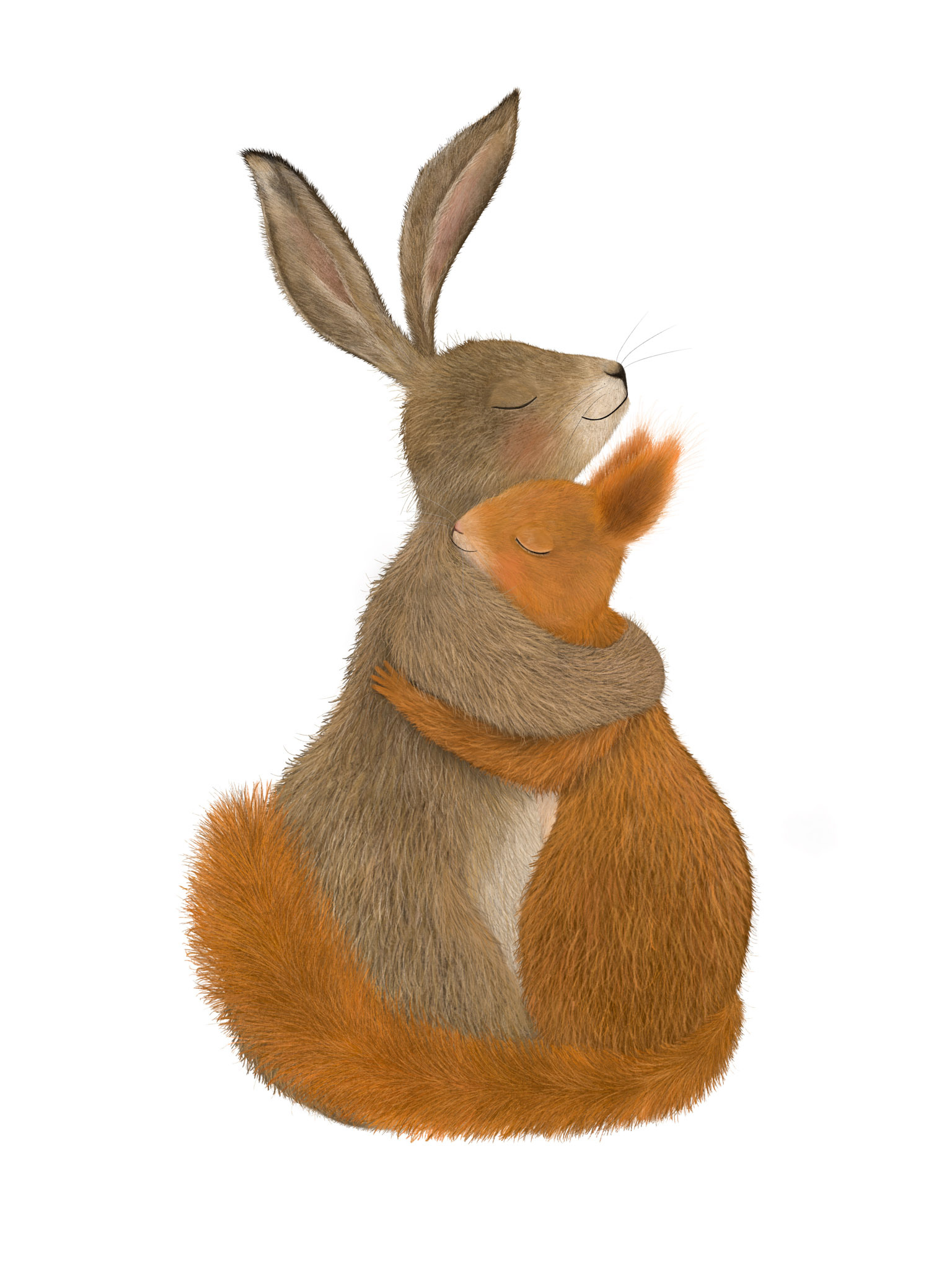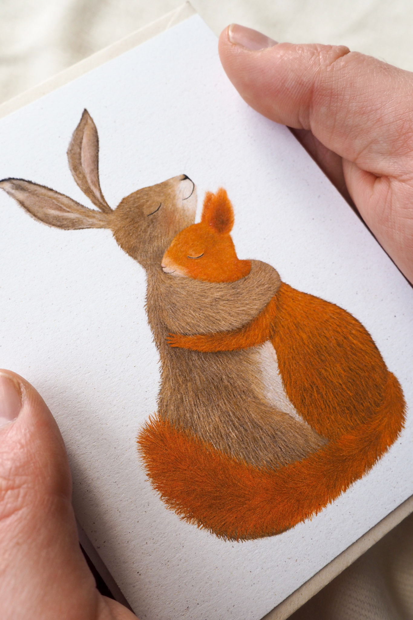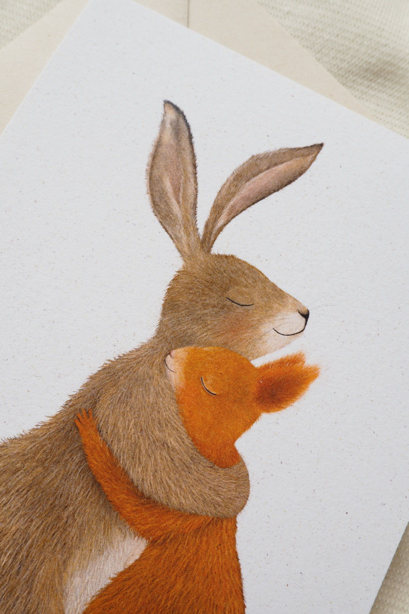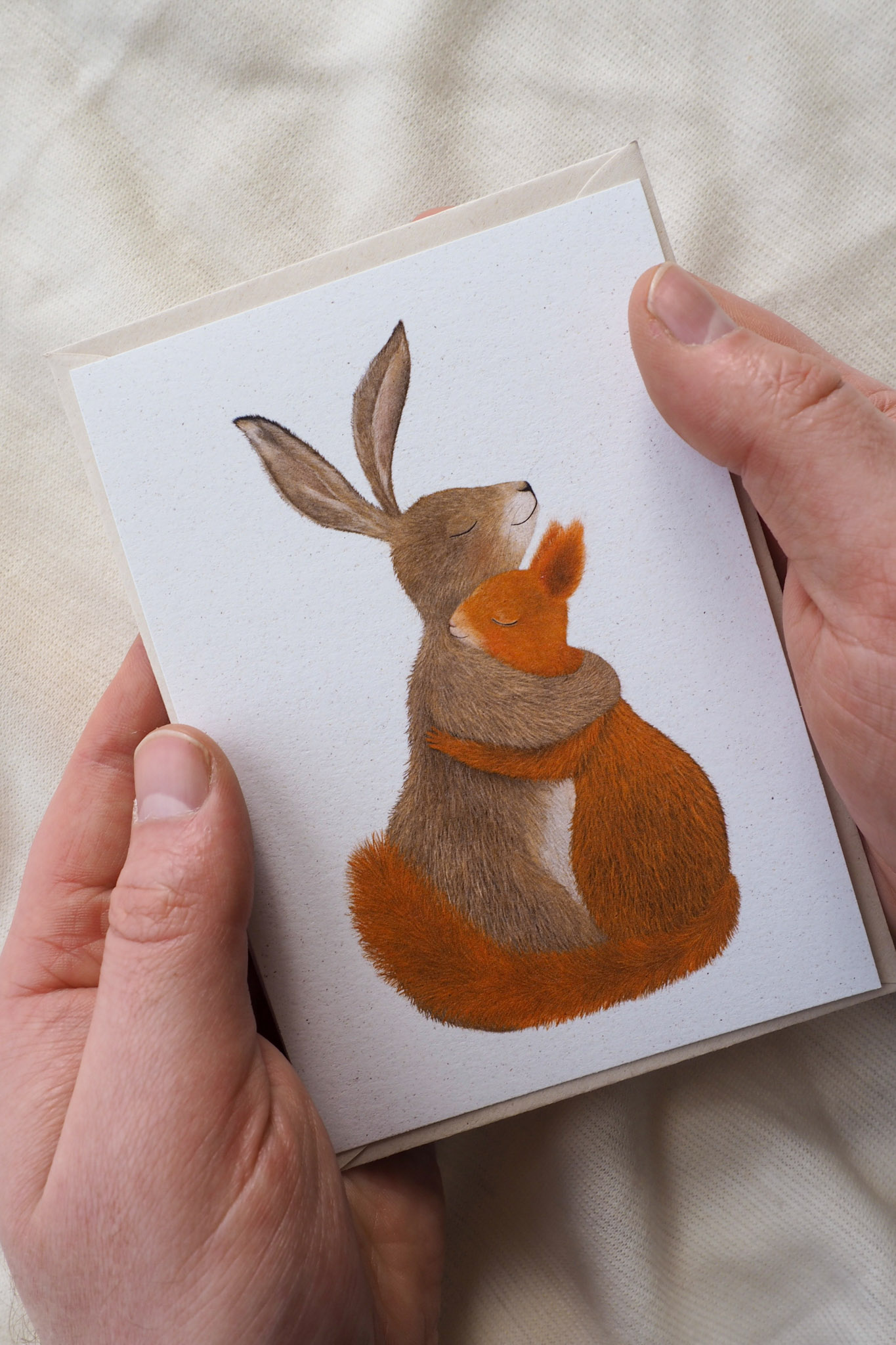 Lieve kaart van Getekenddoorzusje van twee knuffelende dieren, A6 formaat.