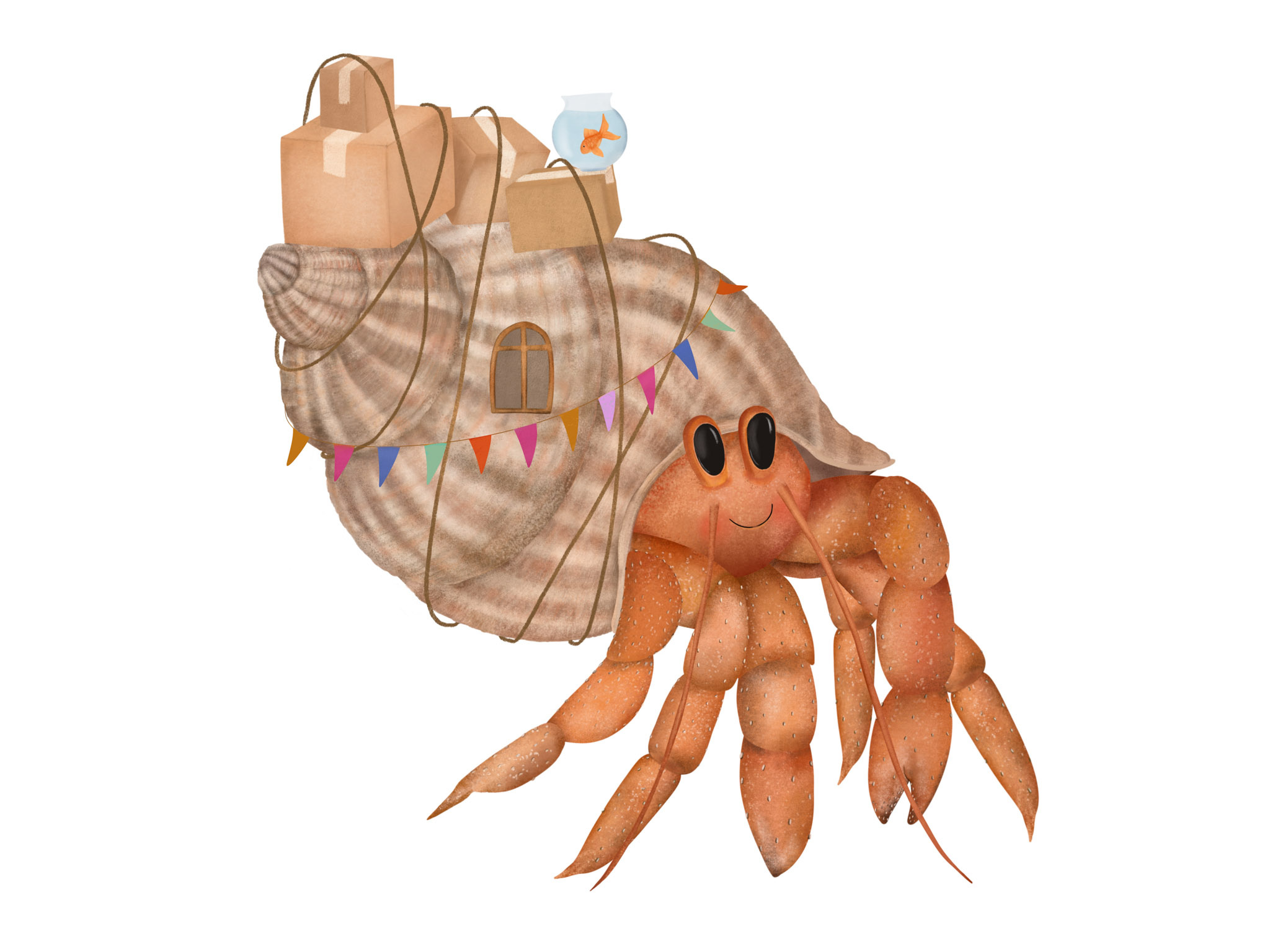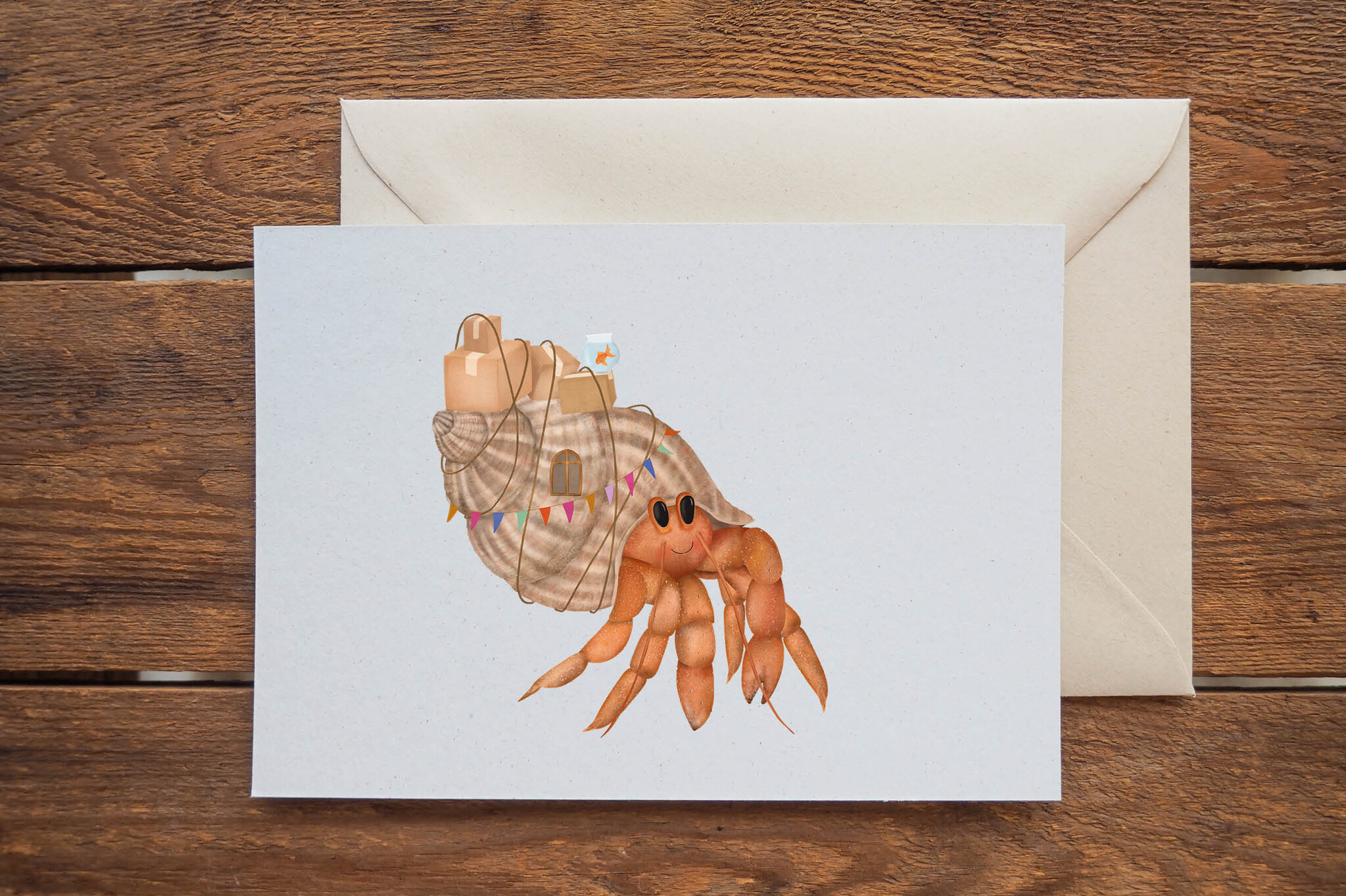 Grappige kaart van Getekenddoorzusje van een heremietkreeft met dozen op z'n rug. Leuke verhuiskaart op A6 formaat.