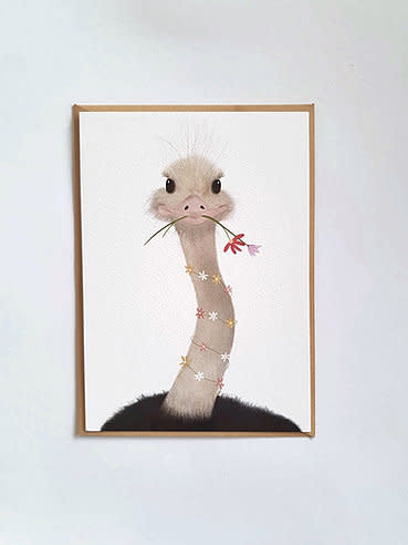 Lieve kaart van Getekenddoorzusje van een struisvogel met bloemen in z'n bek en om z'n hals, A6 formaat.