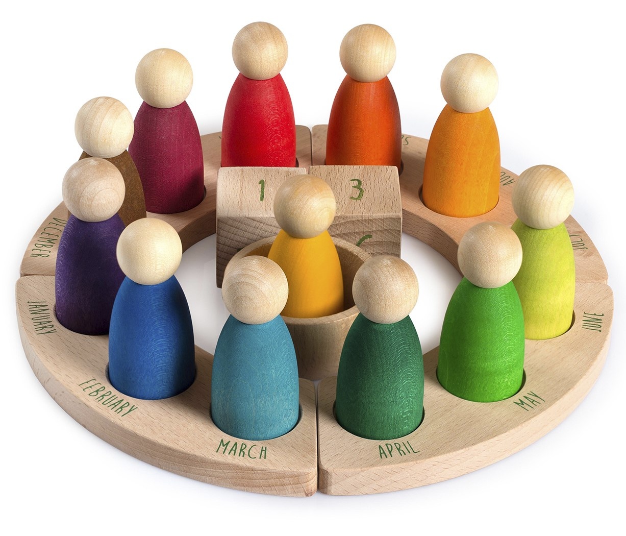 Met deze mooie houten kalender leren kinderen het begrip tijd, seizoenen, maanden en de datum begrijpen. De set bestaat uit een vierdelige houten ring met daarop de maanden in het Nederlands geschreven, 12 gekleurde houten poppetjes, 2 houten blokjes met cijfers en een houten kommetje.