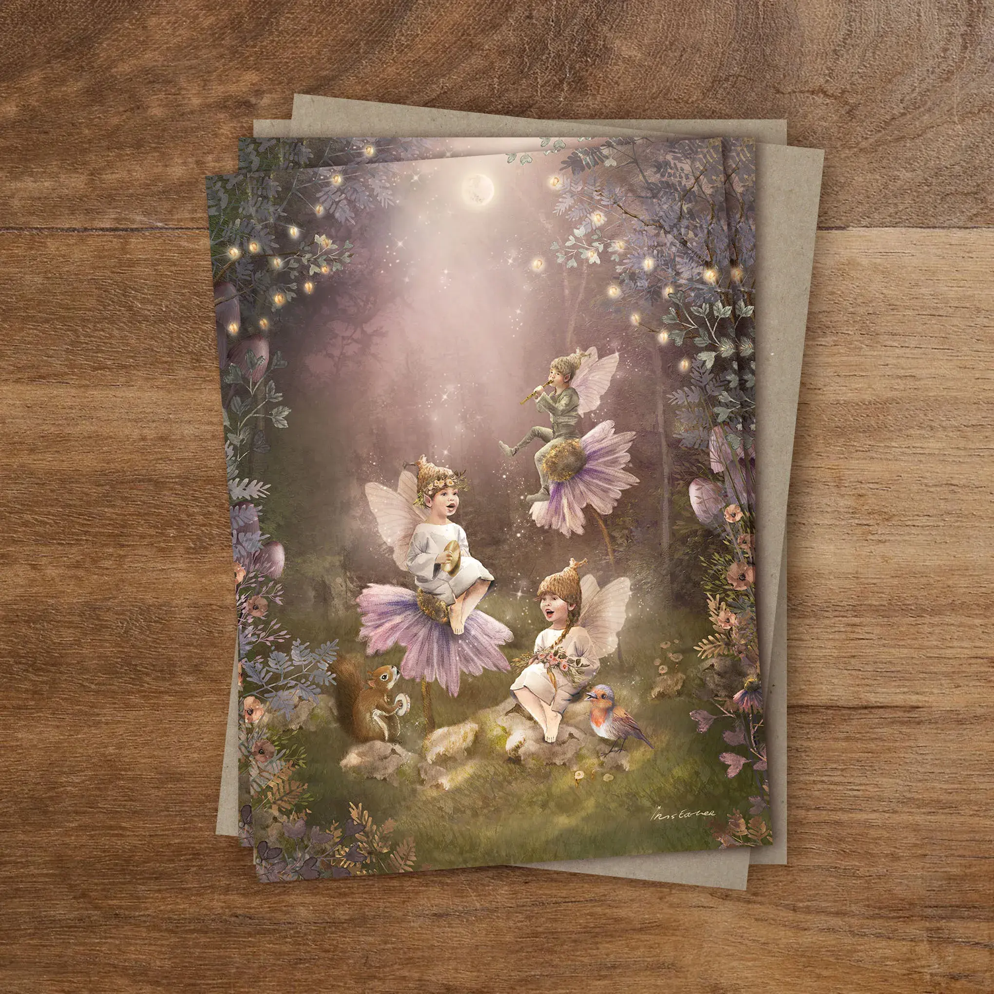 Dubbele wenskaart met een prachtige illustratie van Iris Esther. Een magisch momentje tussen deze elfjes op een heerlijke zomeravond, waarop zij het midzomer feest dansen en vieren. Lees meer