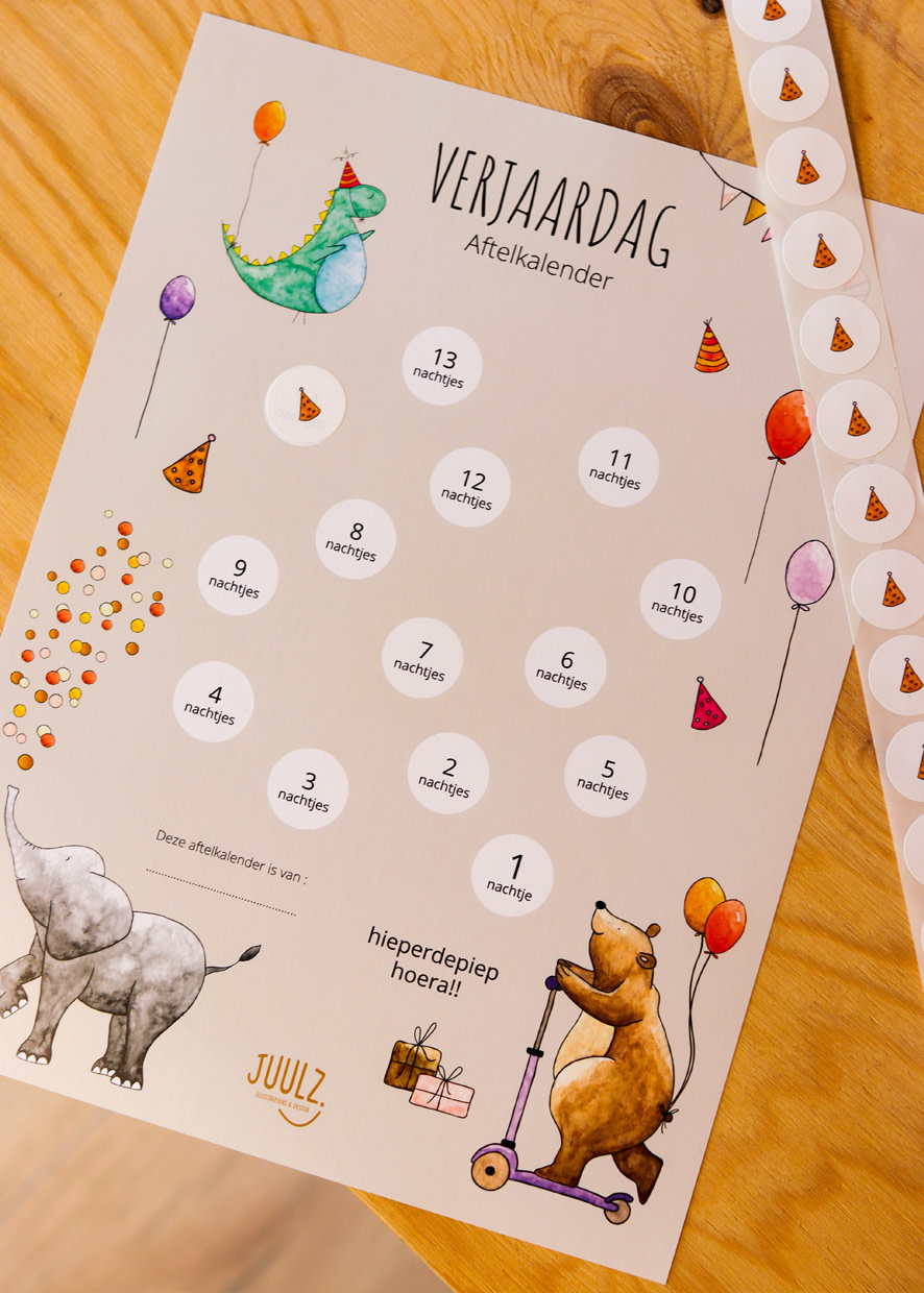 Leven jouw kinderen ook altijd zo naar hun verjaardag toe? En krijg je dagelijks de vraag: Ben ik morgen jarig??!! Met deze prachtig geillustreerde aftelkalender kunnen de kids iedere dag een sticker plakken. Vanaf 14 dagen tot de grote dag! Zo kunnen ze iedere dag zien hoeveel nachtjes het nog slapen is. Rust voor zowel de ouders als de kids!