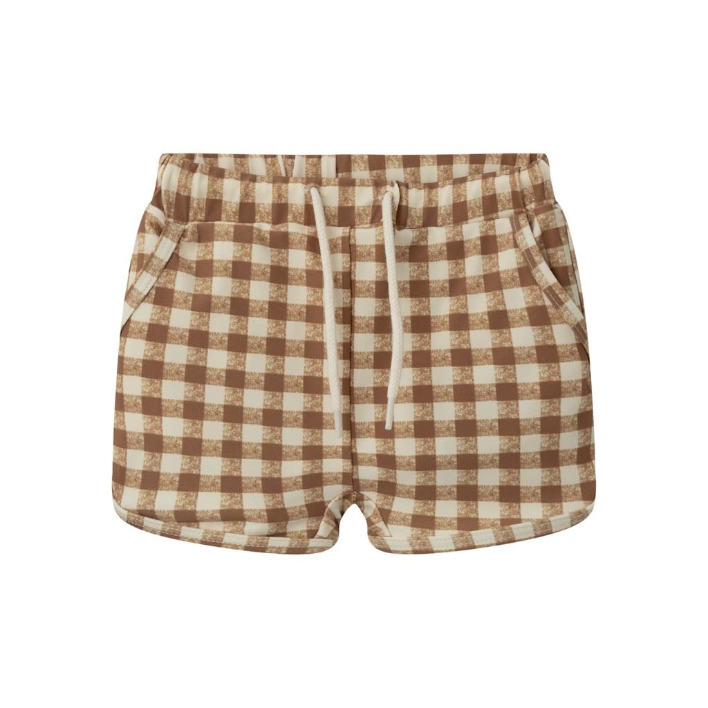 Lief zwembroekje voor de kleintjes. Comfy en flexibel shortje met elastiek en een touwtje door de taille. Een mooi ruitje is een tijdloos printje.