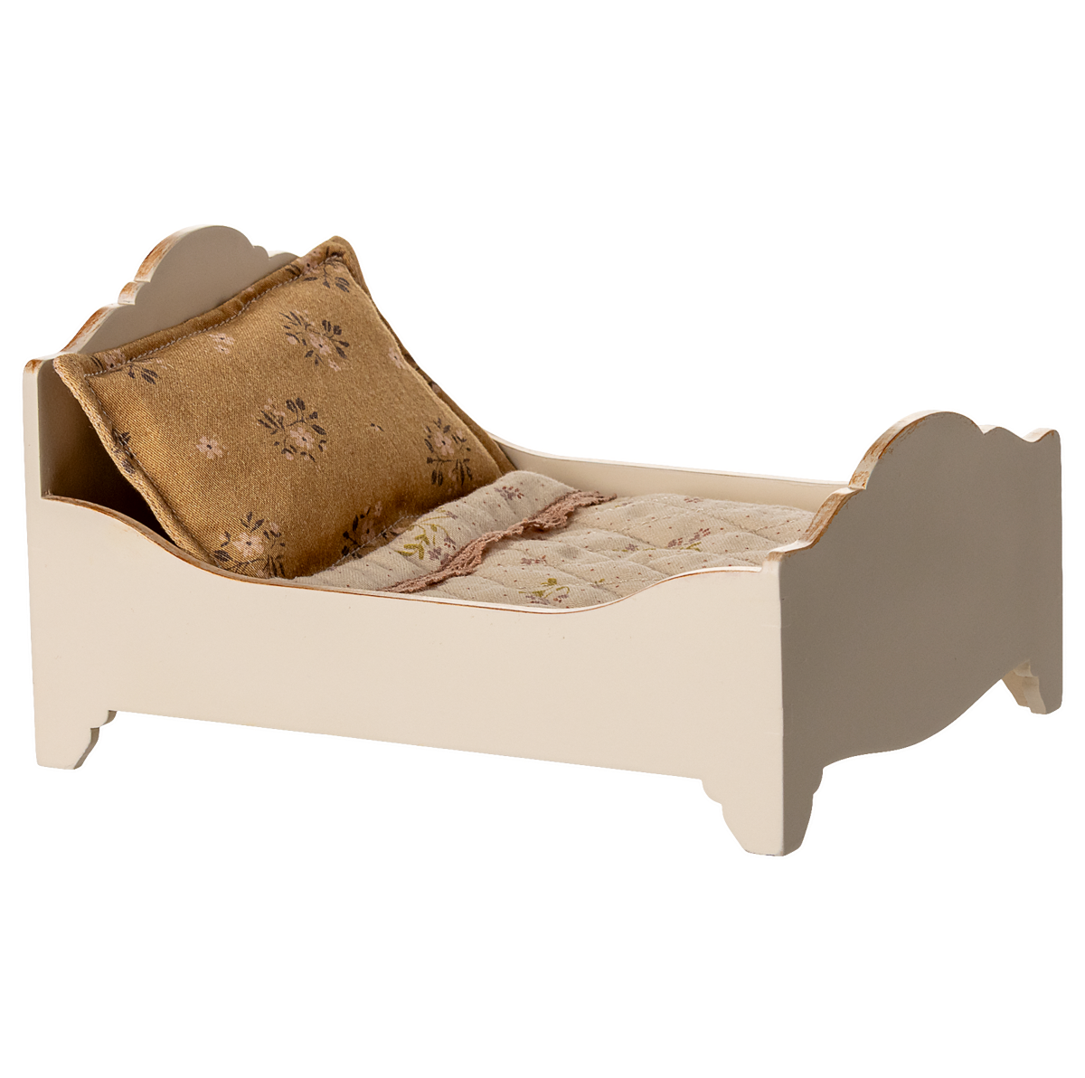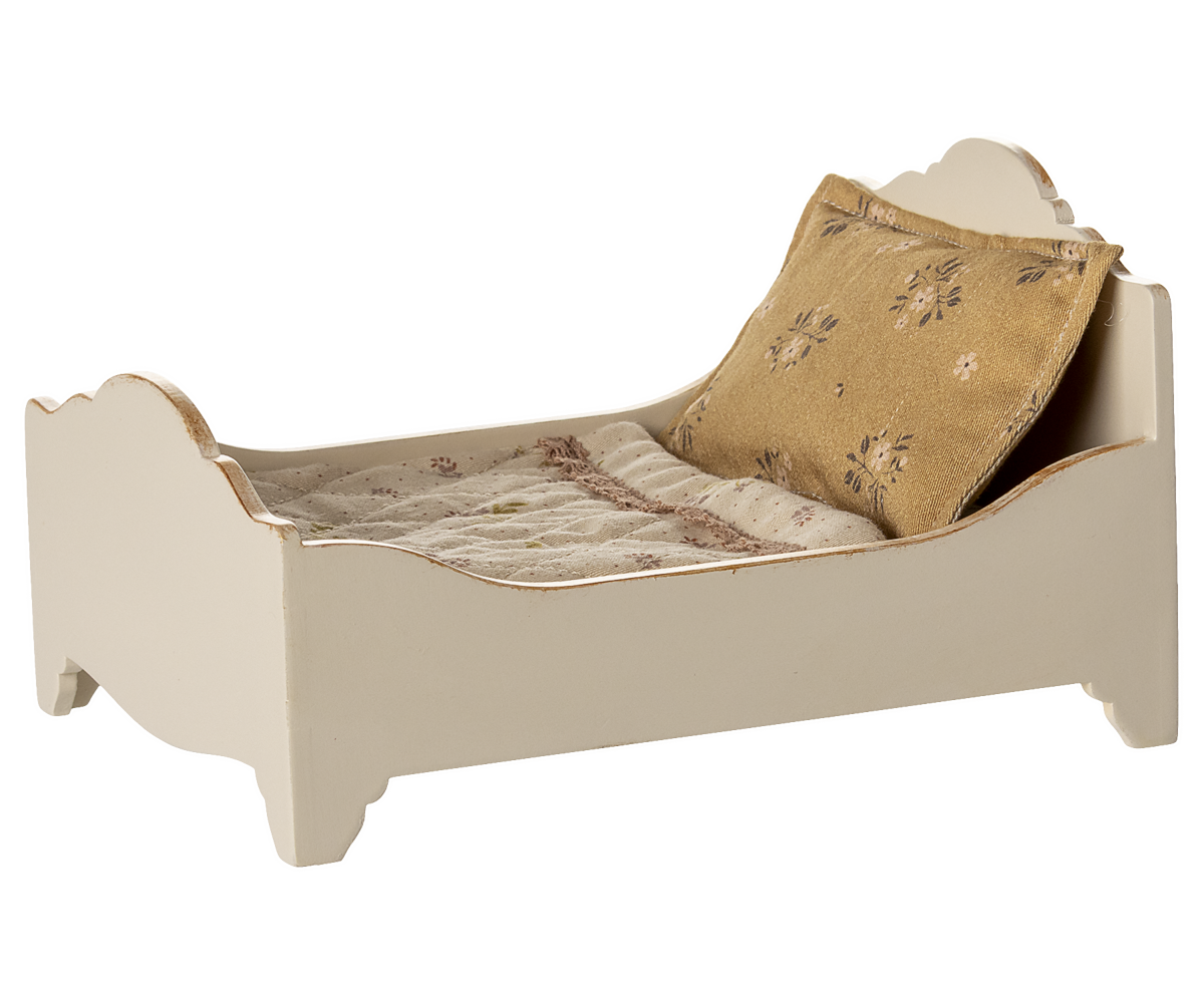 Houten bed van Maileg waar twee muisjes tegelijk in kunnen slapen. Met gouden accenten en prachtig beddengoed. Lees meer