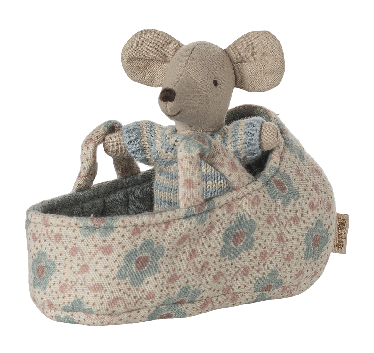 Schattige Maileg baby muis in een gebreid pakje ligt heerlijk in de reiswieg Lees meer