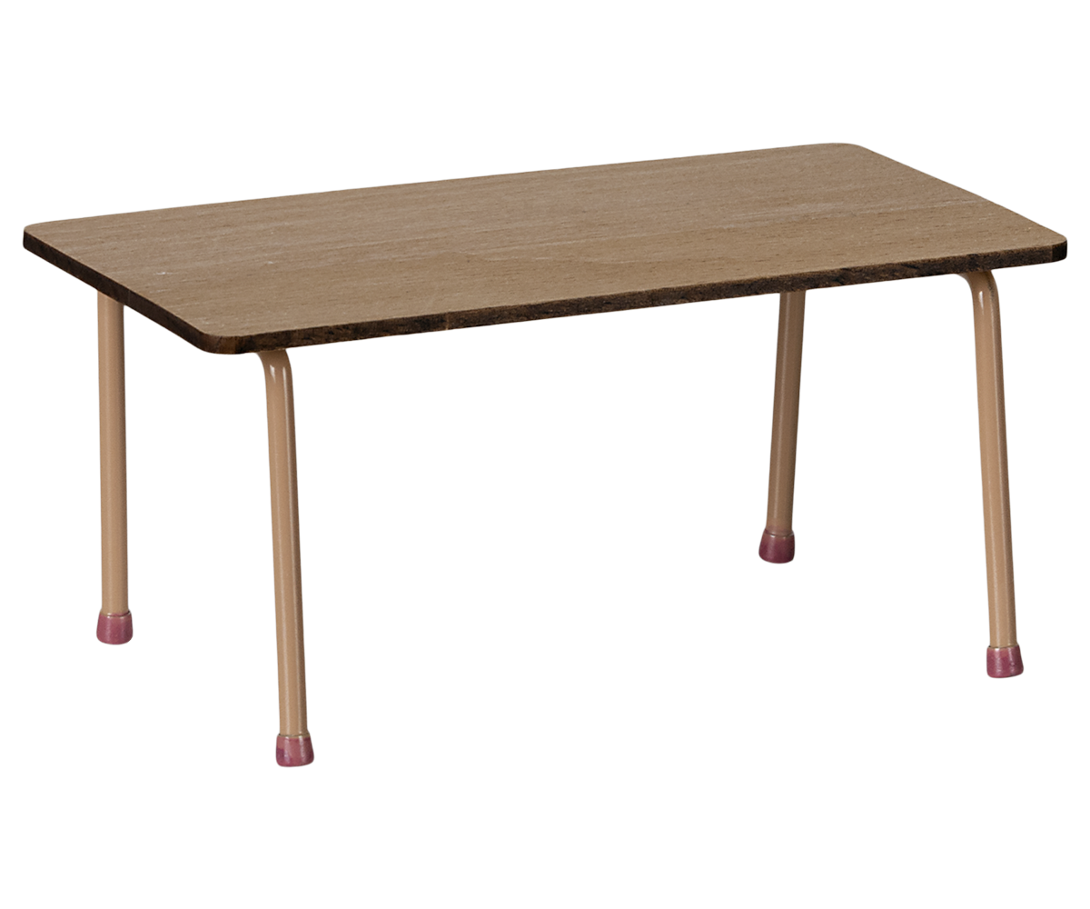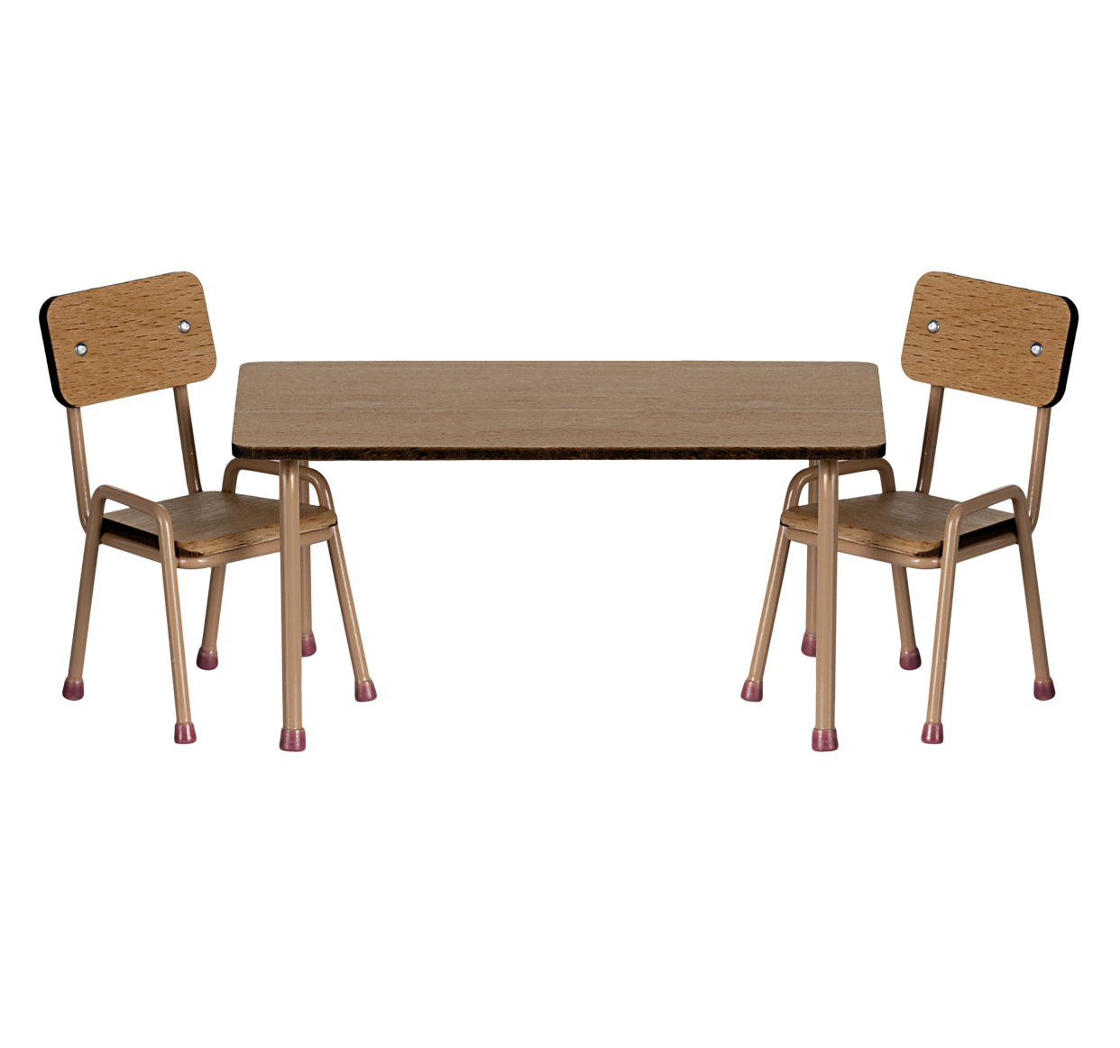 Alle muizen aan tafel! Met deze mooie houten tafel en twee stoelen kunnen alle muizen gezellig samen eten. Er is nog ruimte om extra stoelen aan te schuiven. De doppen op de poten zijn handgeschilderd.