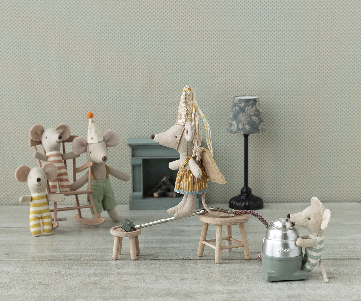 Prachtige Maileg stofzuiger om het muizenhuis goed schoon te maken. De stofzuiger is deels van metaal en deels van polyester. De slang is flexibel. Muizen met magneetjes in hun handen kunnen de stang echt vasthouden.