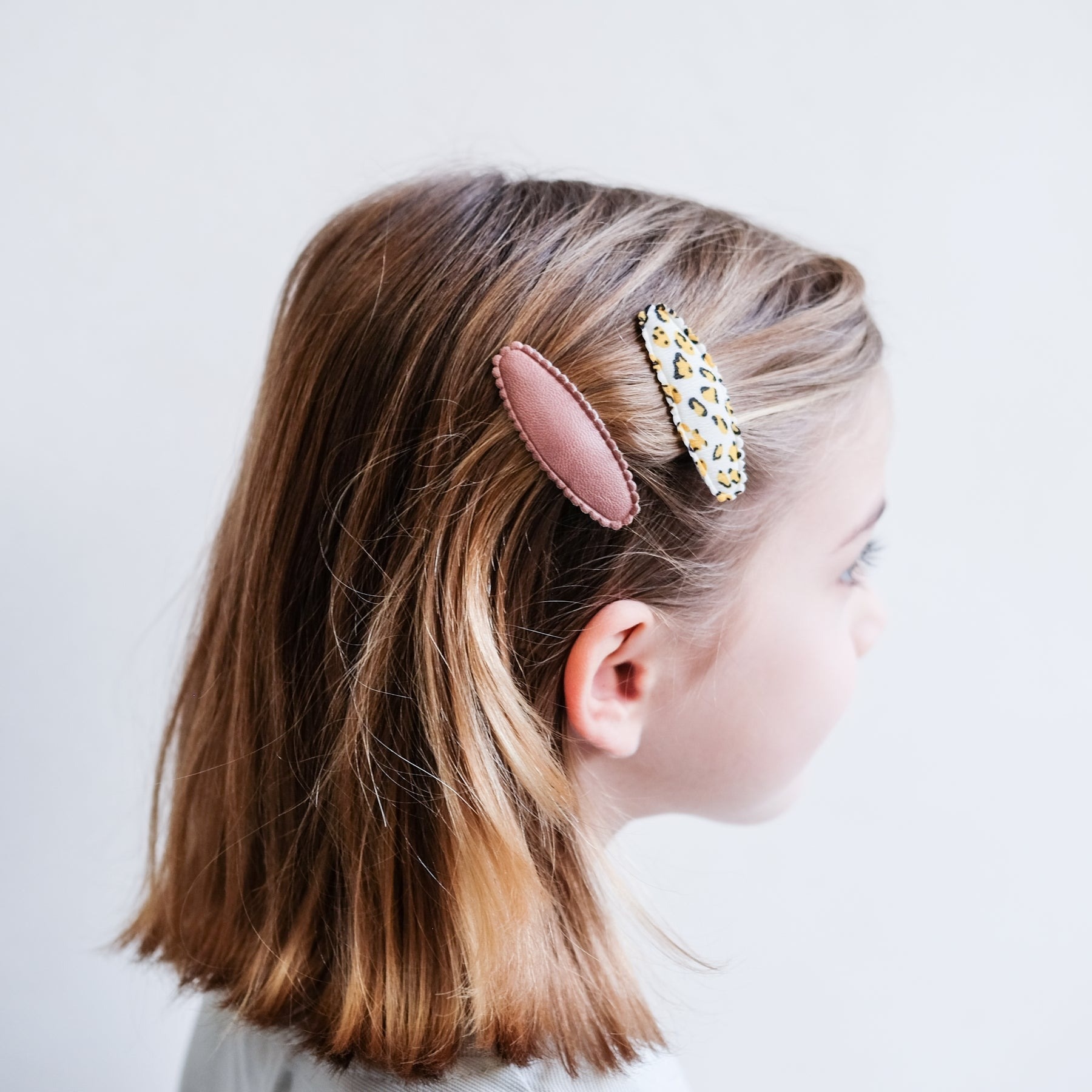 Versier je haar met deze mooie knipjes. De haarspeldjes hebben een geschulpte rand en zijn bekleed met luipaardprint, effen suède kleur en een metallic look.